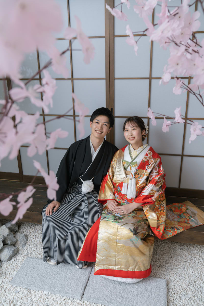 お二人の希望で桜の木と紅葉の木を使った縁側のショットを撮影📷