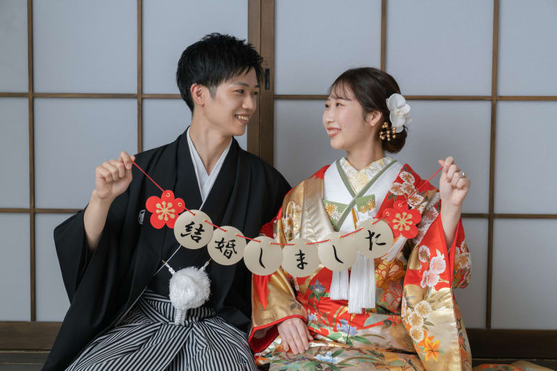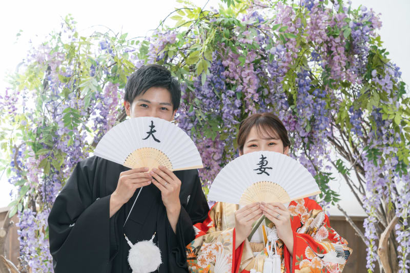 お持ち込みいただいた扇子やガーランドといった小物を使ったショットも和装ならではのショットになりとても素敵でした😊