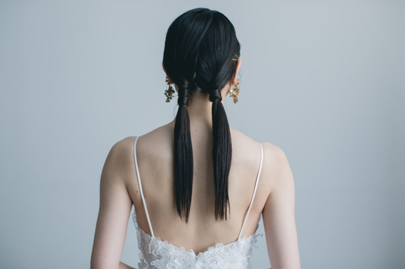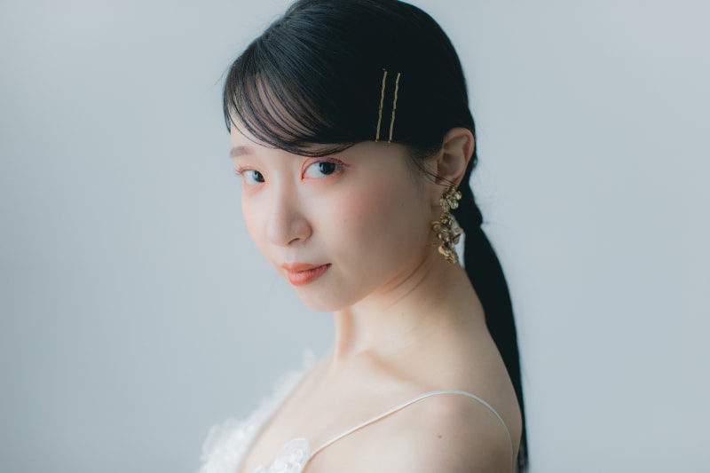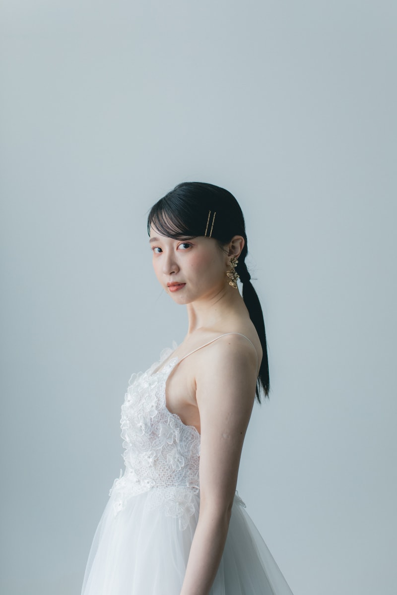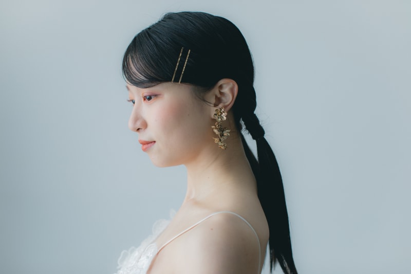 ヘアがシンプルな分、イヤリングだけでなくゴールドピンなどで遊び心あるアクセサリーも相性抜群です!