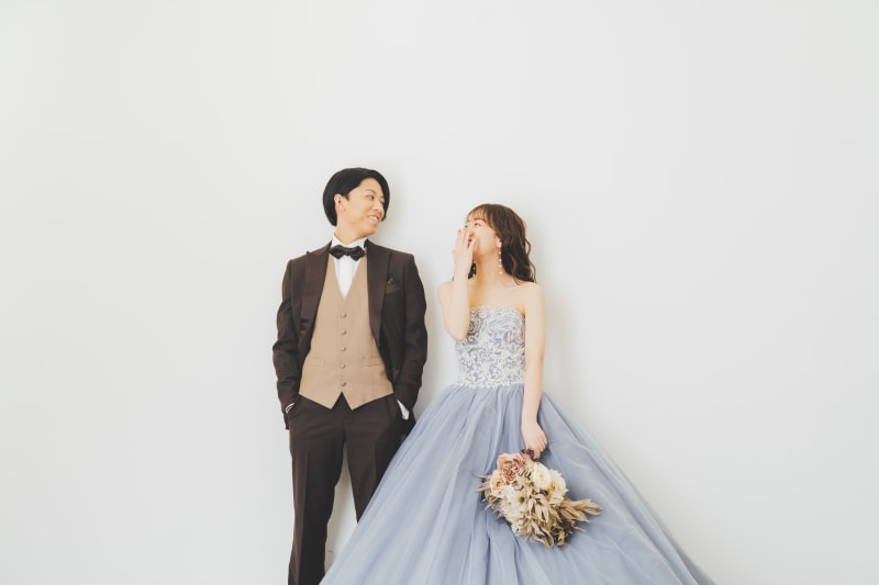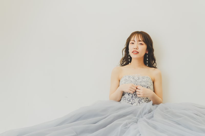 店舗に戻ってスタジオで淡いブルーのカラードレスにチェンジ!