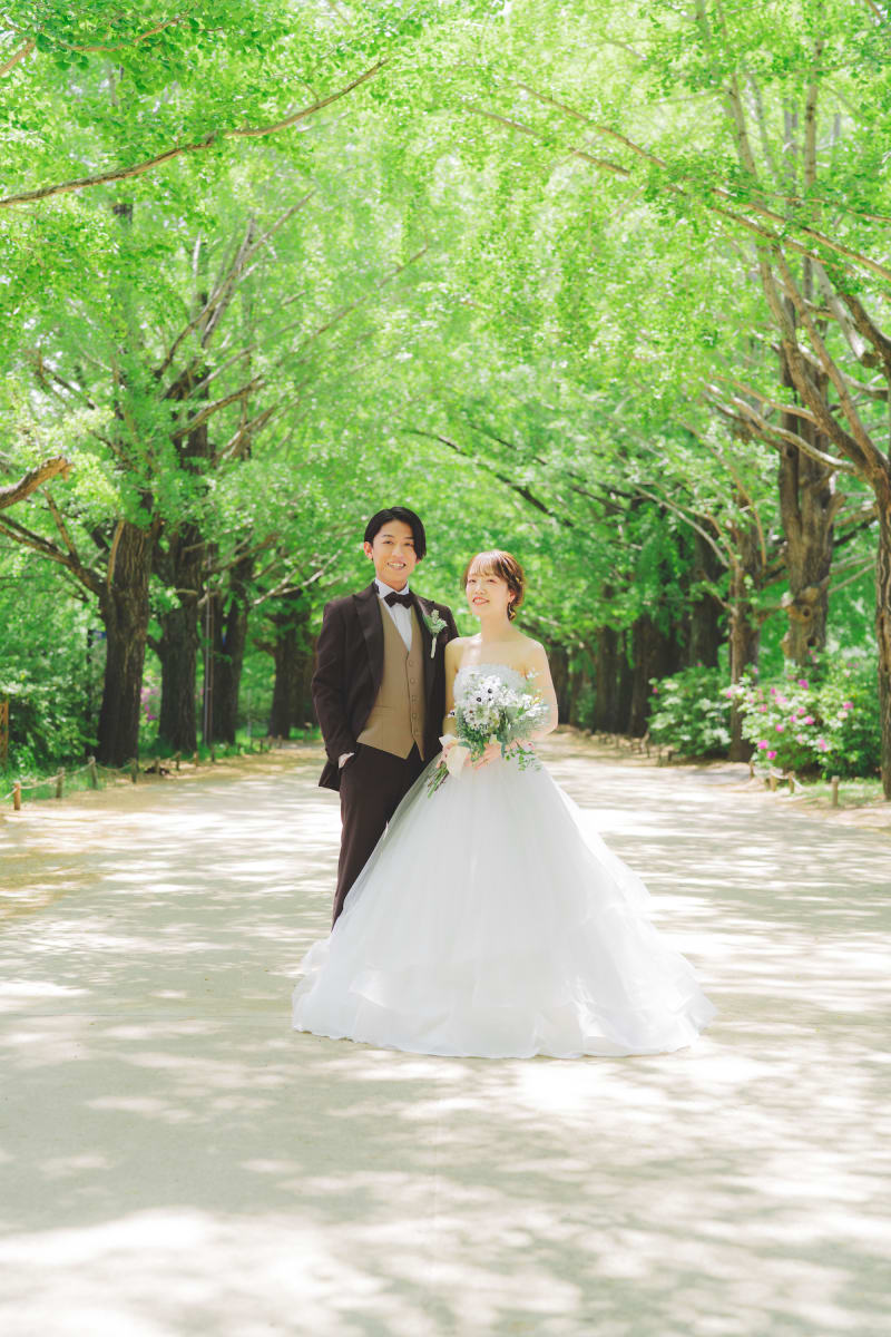 フォーマルな写真は新緑が綺麗ないちょう並木で撮影