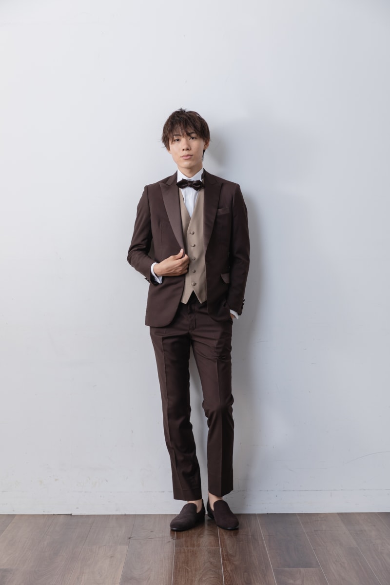 ブラウンのタキシードと合わせると一気にお洒落なお二人の完成です!
