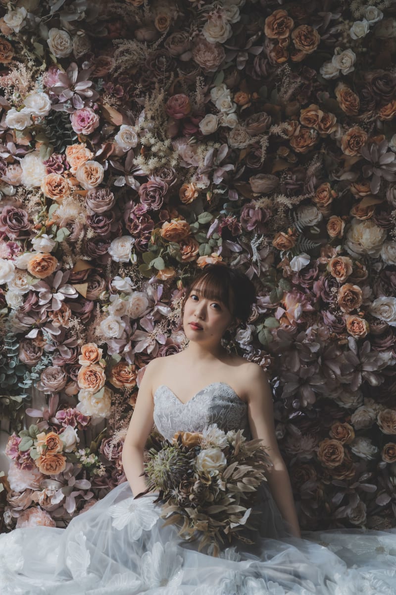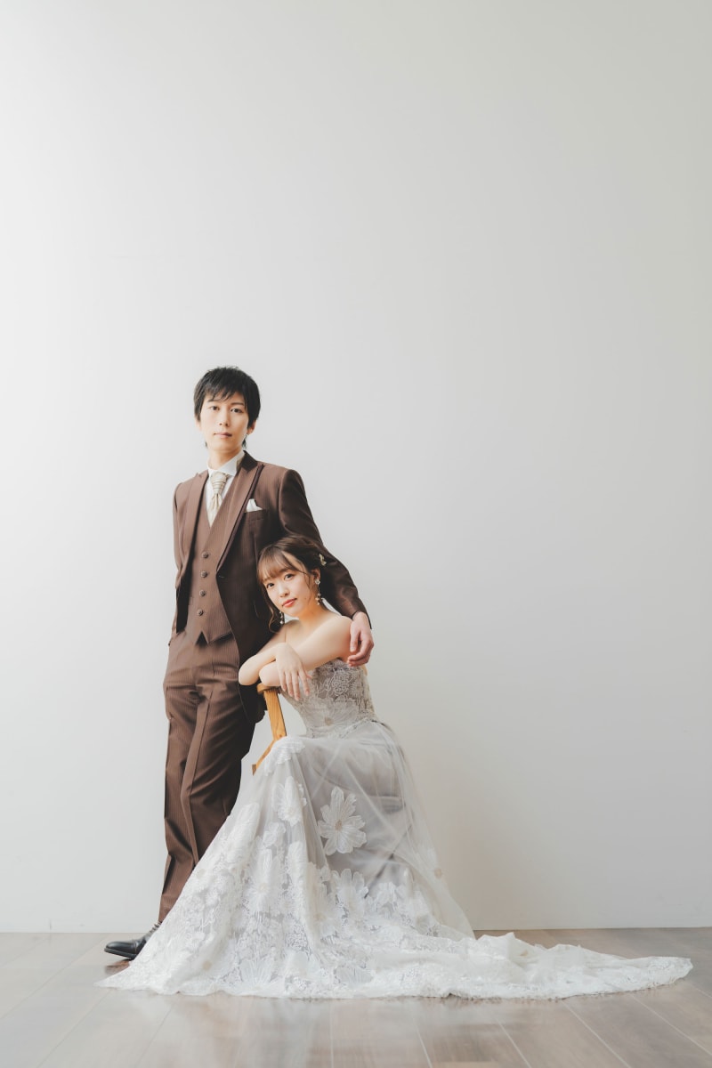 前撮りはカジュアルなドレスで!と検討されていましたが、やっぱり王道の白ドレスも着てみたい!とのことで白ドレスでのオプション撮影を追加いただきました^^