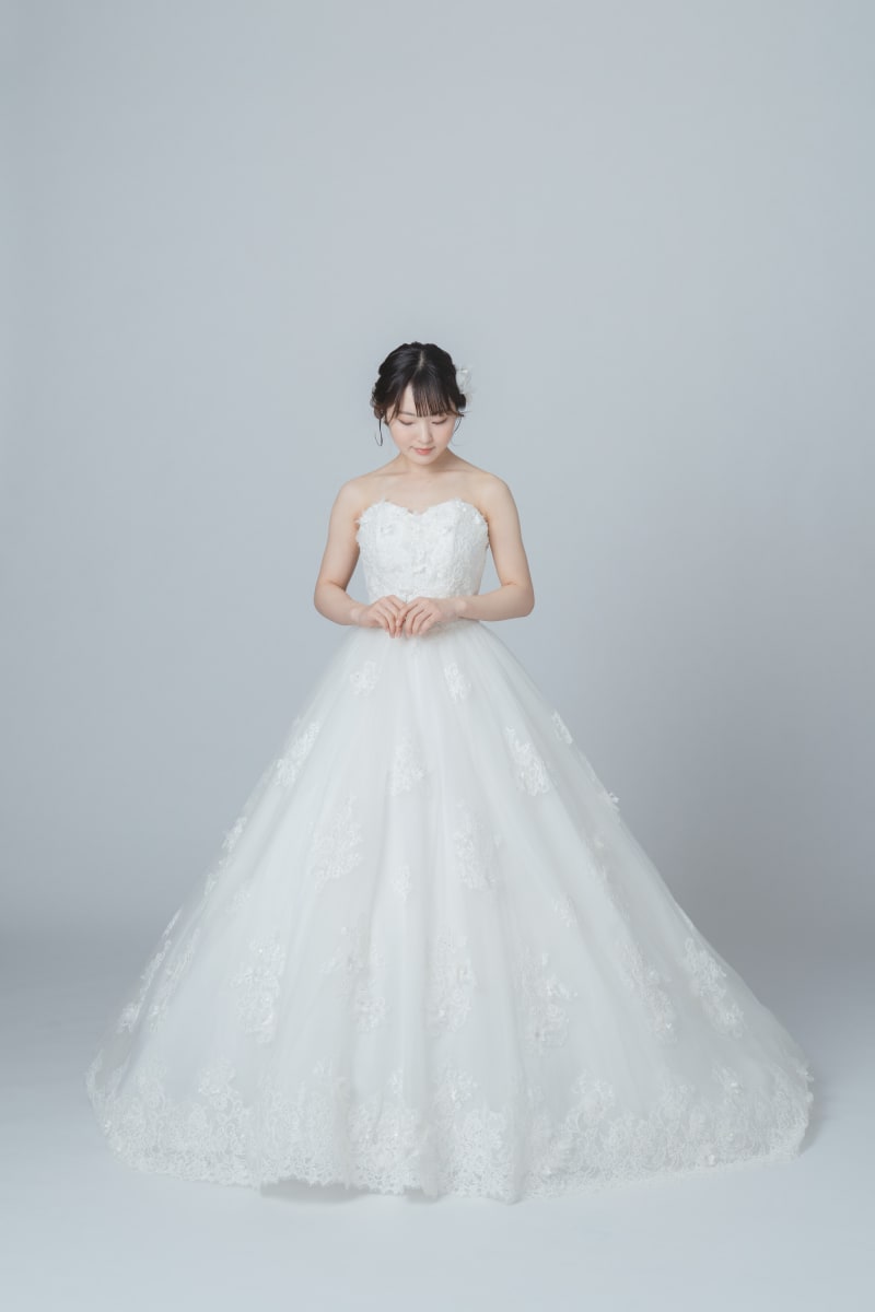 ビッグラインの華やかなシルエットに繊細なレースで刺繍が施されているとても可愛らしく華やかなドレスになっております。
