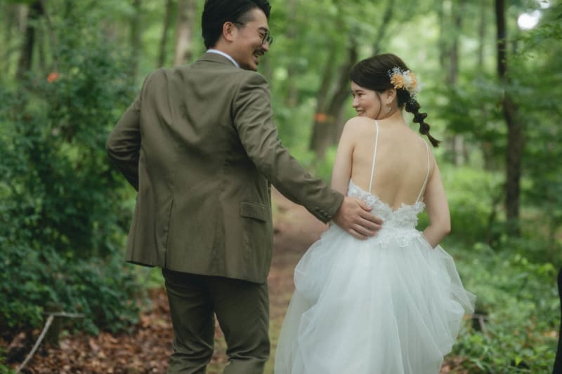 ドレスを気にしながらテクテク歩く新婦さん。そんな新婦さんを気遣う新郎さん。