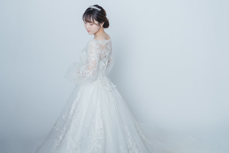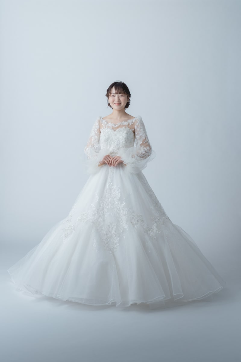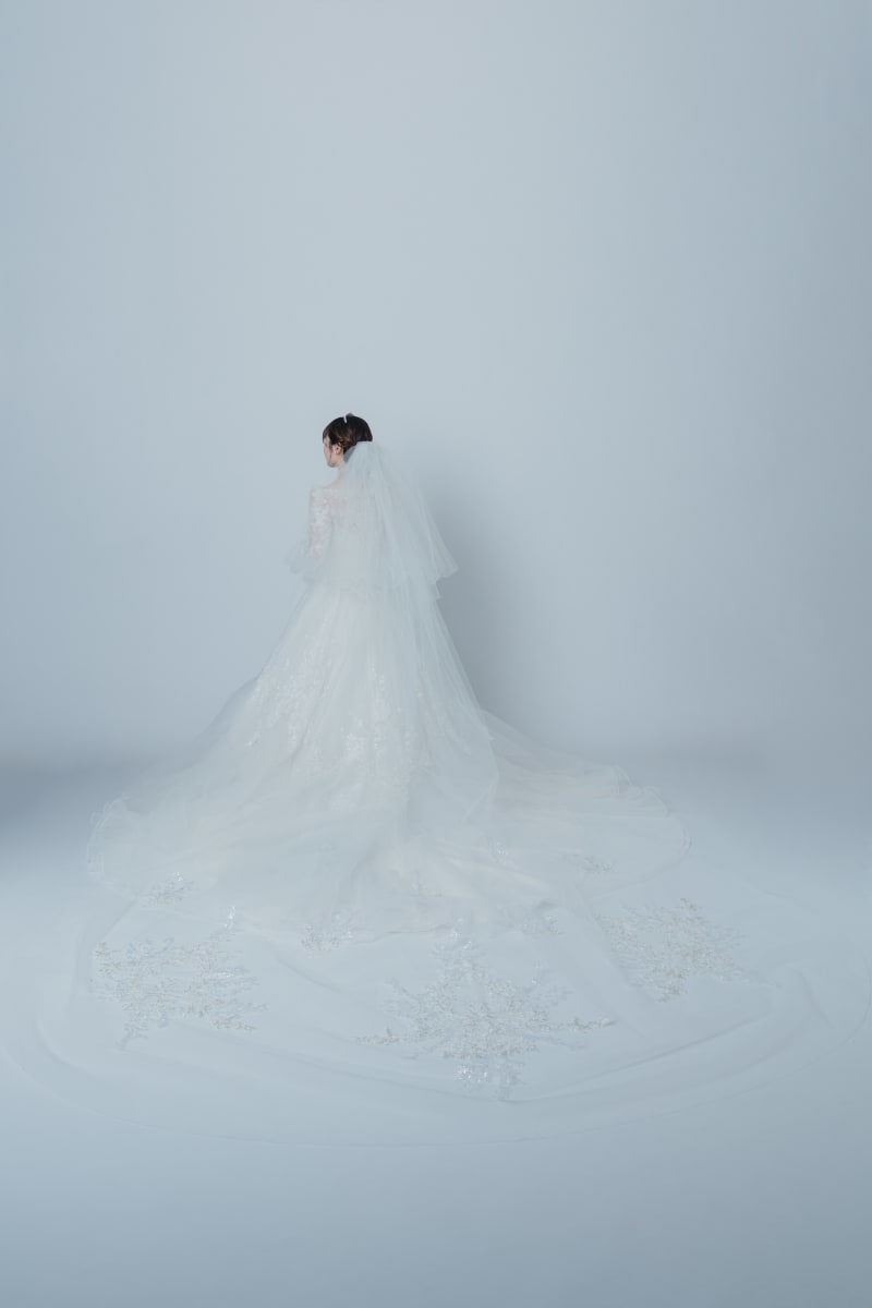 幾重にも重ねたチュールのボリューム感だけではなく、ビーディング刺繍、スパンコール、グリッターと異なる光を放つ3種類のマテリアルを組み合わせ、360度どこから見ても美しく、光り輝く花嫁を演出します。