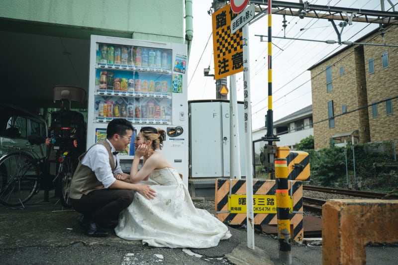 踏切前に移動して、自販機の前で映画のワンシーンの様なお写真を