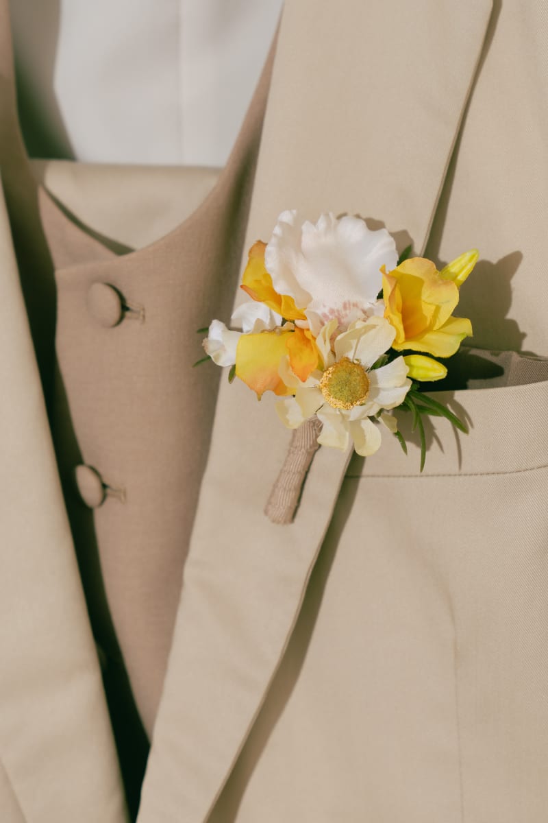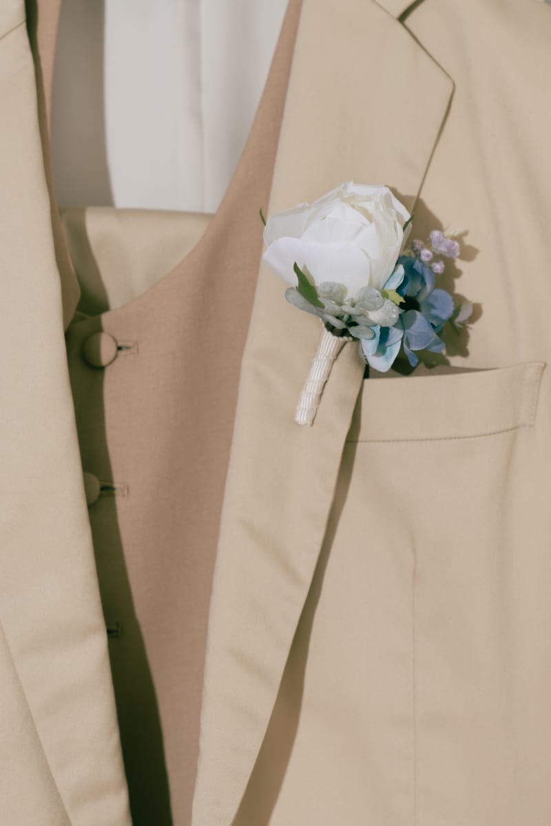 新郎様の胸元には、ブーケとお揃いのブートニアを付けるので新郎様のタキシードの色味