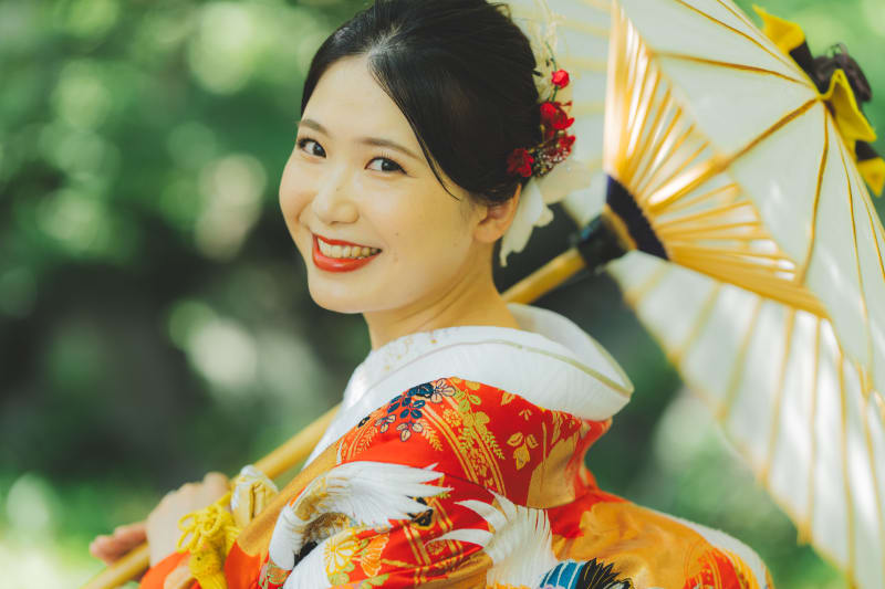 新婦様の赤い色打掛が緑にとっても映えますね!