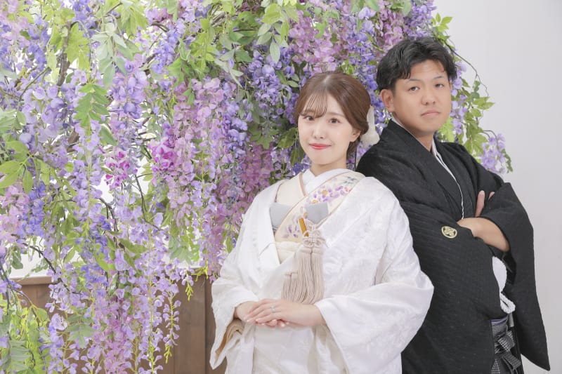 白無垢の中は藤の花の掛下とグレーの小物で淡いカラーにまとめました。