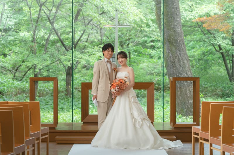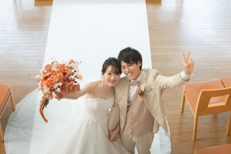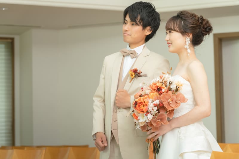 新郎様のベージュのタキシードと新婦様のオレンジ色のブーケが暖色系で統一感があって可愛かったです!