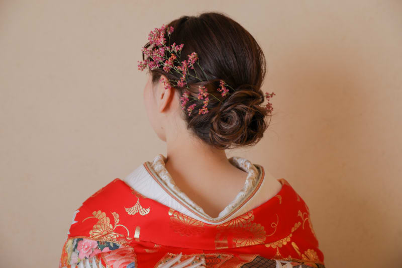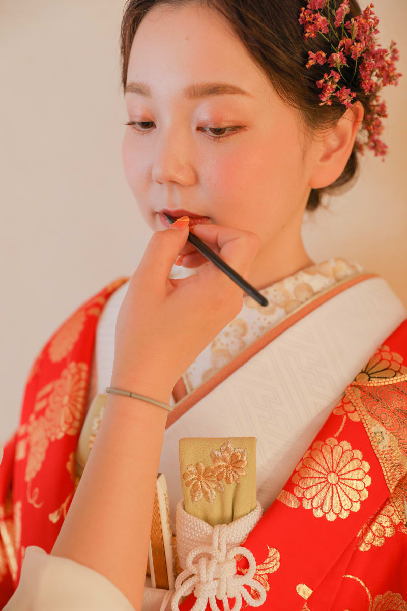 和装ではツルッとしたスタイルに前髪をあげて大人っぽくボルドーメイク、髪飾りは赤のドライフラーでシンプルに!