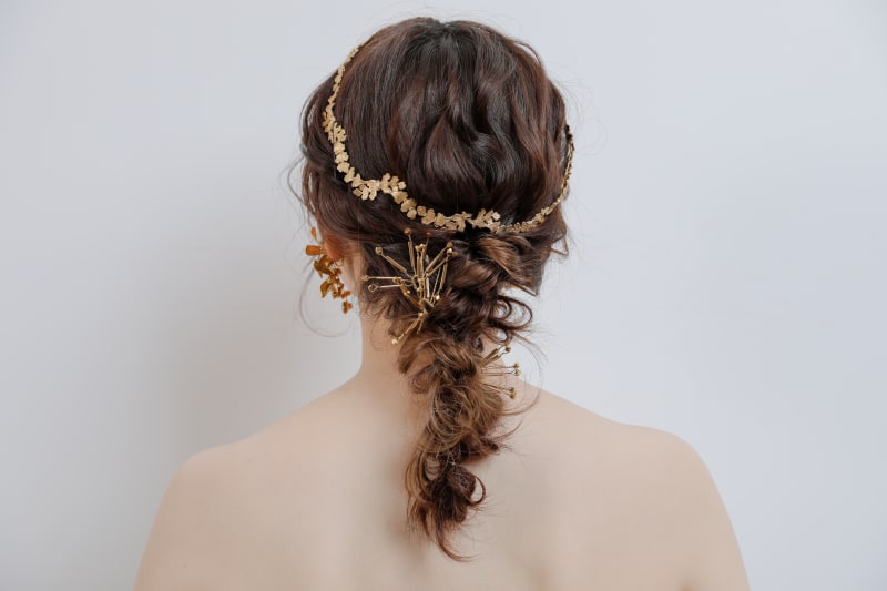 洋装では前髪、おくれ毛を出しゆるふわの編みおろしヘアにチェンジ。