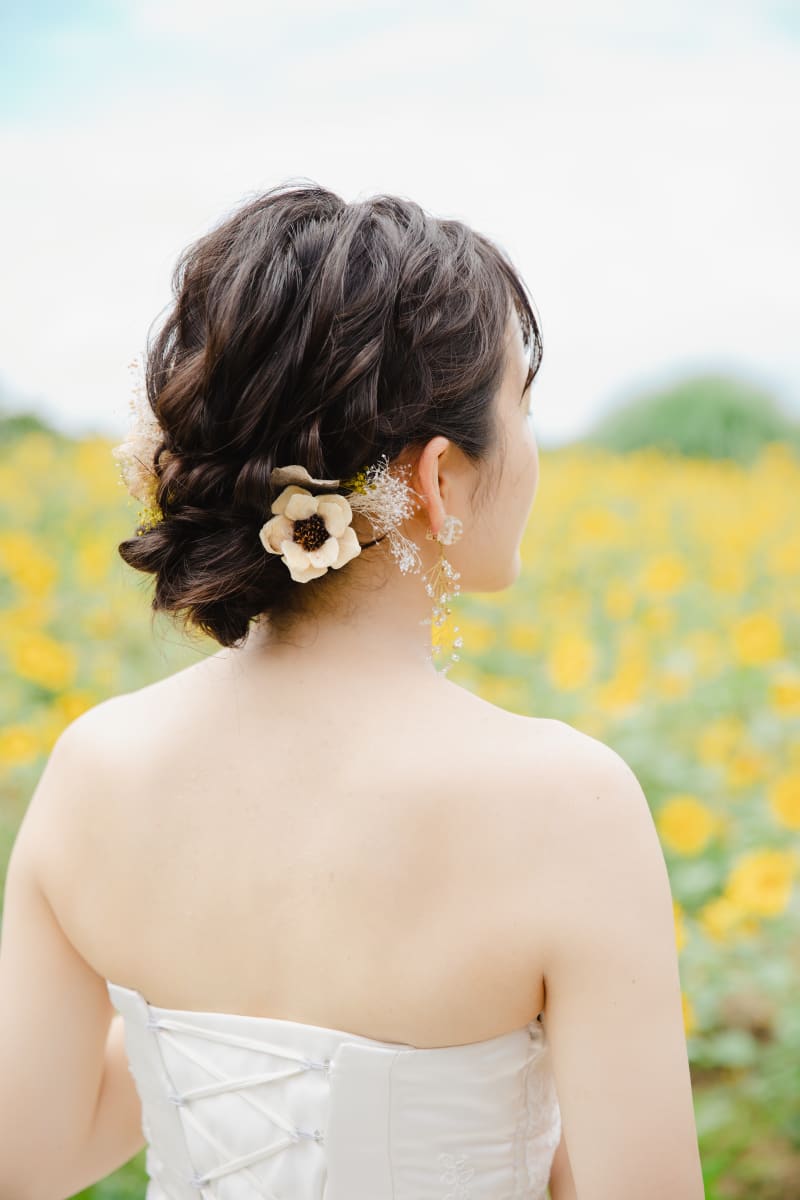 ドライフラワーをつけたフワッとシニヨンを提案させていただきました。