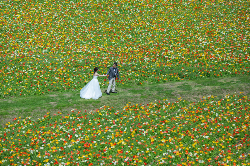 上から写すポピー畑は、一本道を歩くだけでも絵になりますね