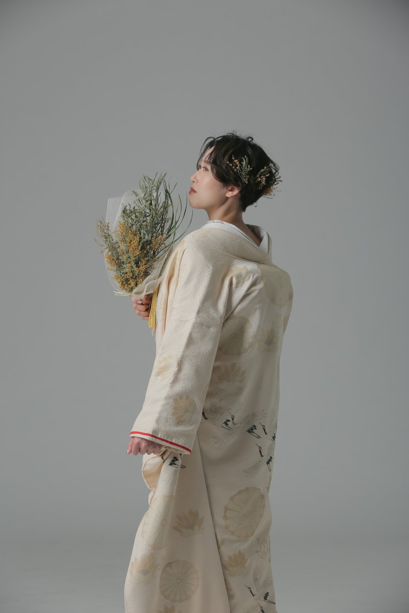 和装は新婦様がミモザのとても素敵なブーケを持ってきてくださったので