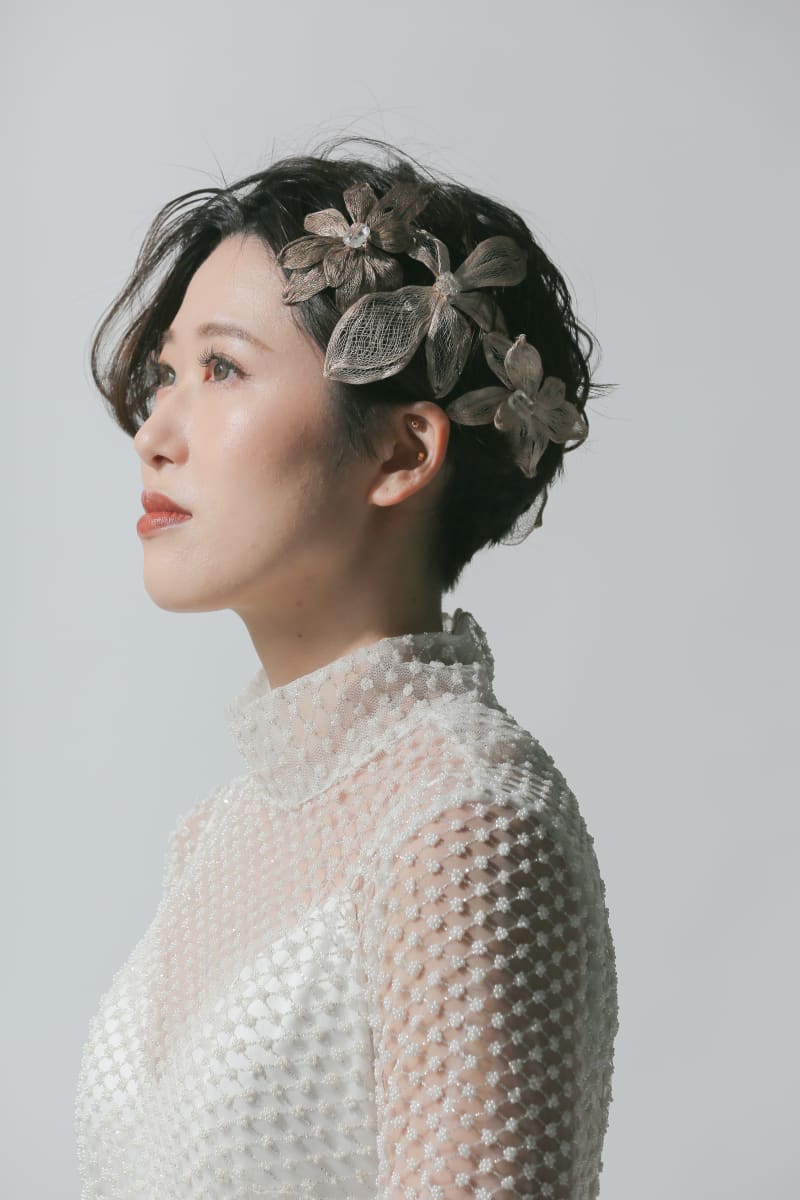 パーマ風のセットに存在感のあるヘッドパーツを合わせました*