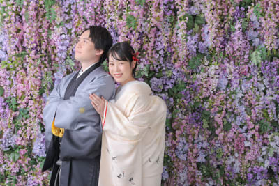 藤の花をバックに撮ると白無垢が映えますね!