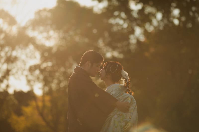 和装のサンセット撮影はドラマティックなフォトウェディングに。