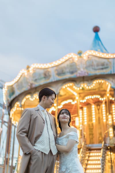 メリーゴーランド前で!この日はまだ日が落ちてない時間帯からの撮影でした。