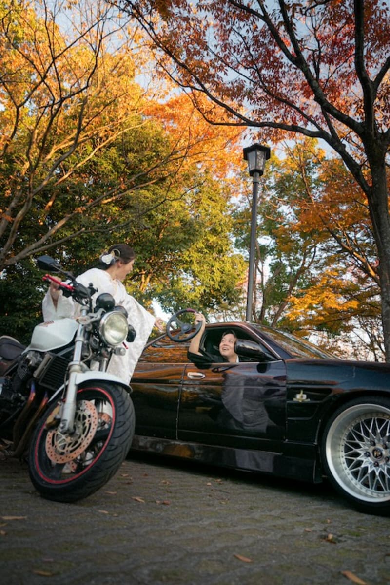 そして愛車&バイクとのショット!まさに「おふたりだけの秋の思い出」。おふたりらしさがギュッと詰まった写真に仕上がりました📸✨