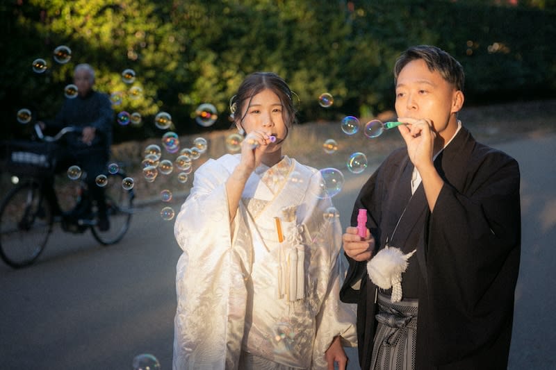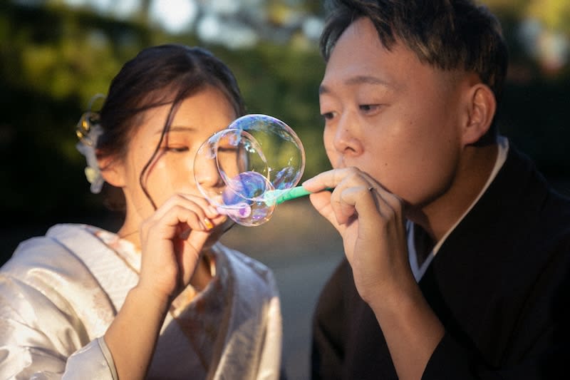 当日は、サウナハットにシャボン玉、愛車とバイク…どれも個性が光るアイテムばかりで、撮影しながらワクワクが止まりませんでした!特にシャボン玉を飛ばして楽しそうに笑うおふたりの姿は、見ているだけで幸せ気分全開でしたよ😊