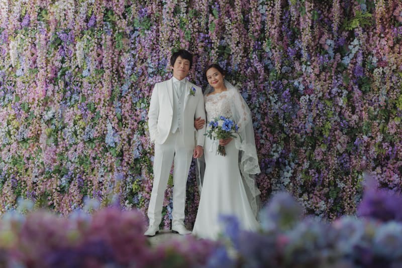純白のドレスやタキシードが、背景の色合いと絶妙にマッチし、特別感あふれる一枚に仕上がります。また、花々の柔らかな雰囲気が、新婦様の持つブーケやベールの繊細さと調和し、写真全体に一体感を生み出します。
