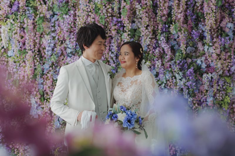 洋装ハウススタジオの最大の魅力のひとつが、華やかで繊細な「花の背景」です。この背景は、四季折々の彩りを感じさせるデザインで、紫や青を基調にした花々がまるで祝福の言葉を贈るかのようにお二人を包み込みます。