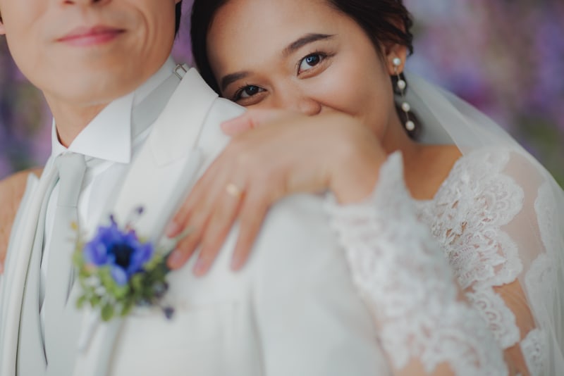 今回の撮影では、レース模様の長めのベールを使用し、柔らかくも優雅な雰囲気を演出しました。ふわりと広がるベールが、背景の花々と調和し、よりロマンチックな仕上がりになっています。また、ベール越しに新郎様と目を合わせるシーンは、どの瞬間を切り取ってもため息が出るほど美しく、写真映え抜群です!