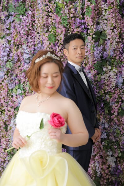 新婦様はディズニーの「美女と野獣」がお好きで店舗に置いてるこちらのカラードレスを気に入ってくださり、新郎様のスーツも同じように色を合わせて選んでくださいました!
