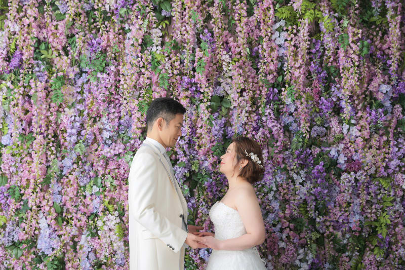 まずは洋装ハウススタジオの風景で白壁と藤の花の背景を使い分け、見つめ合ってるシーンやオフショット風な自然なお写真も撮りました!
