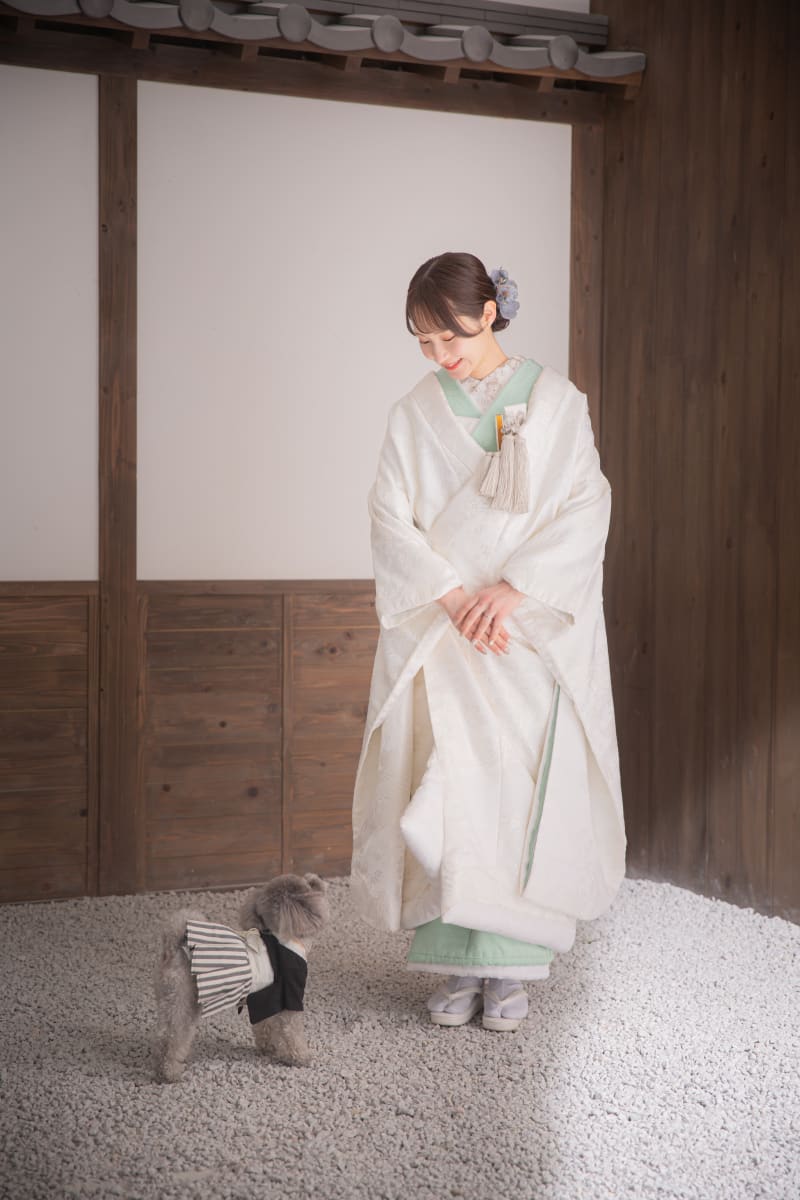 見つめ合いショット!普段とは違った新婦様の姿にワンちゃんも釘付け♡