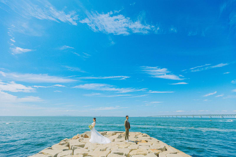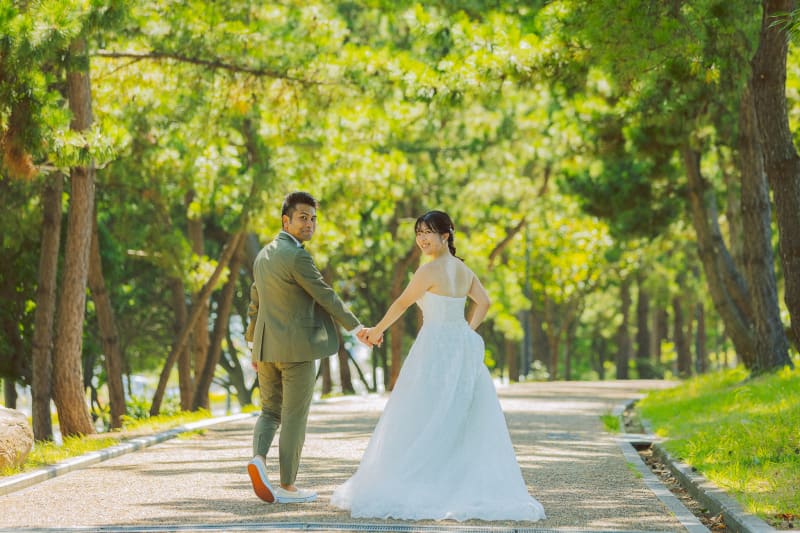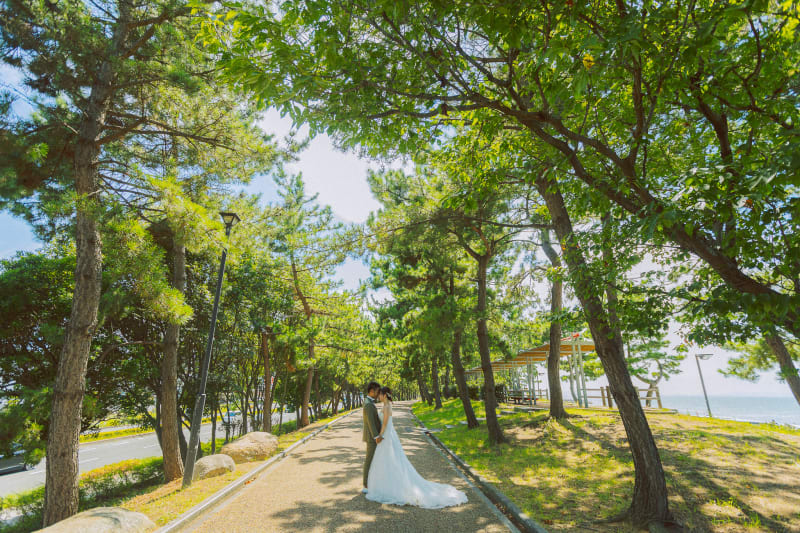 時間帯によっては夕焼け空のなかでのロマンチックな撮影も可能です。