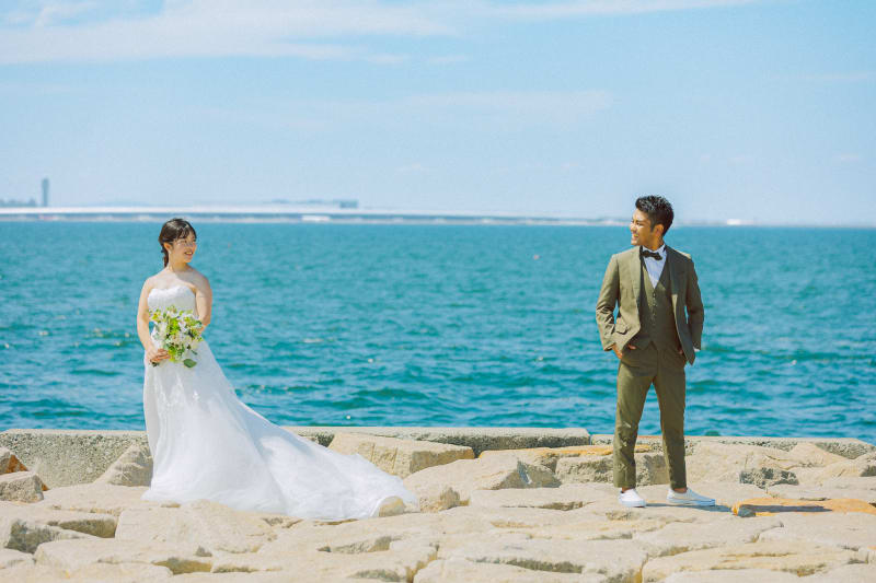 白いウェディングドレスとオリーブ色のタキシードが青い海に映えますね!!