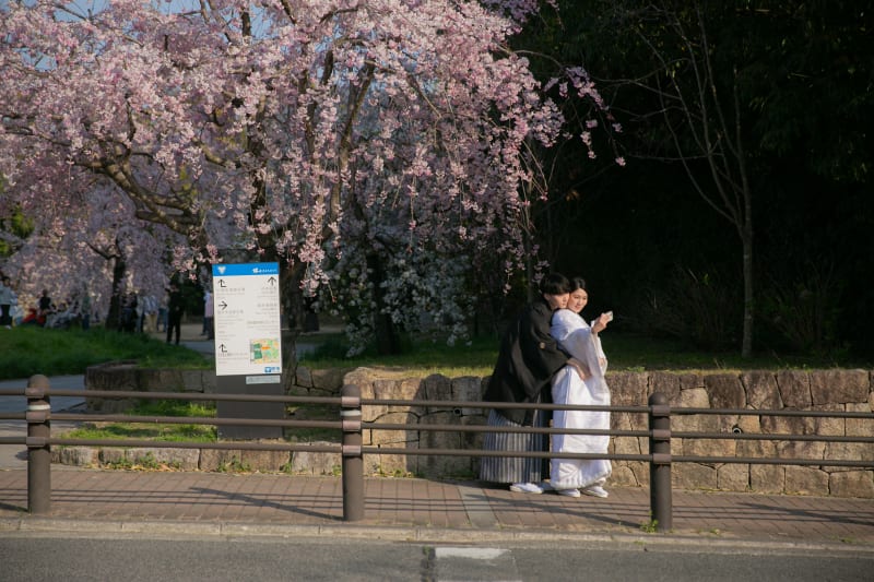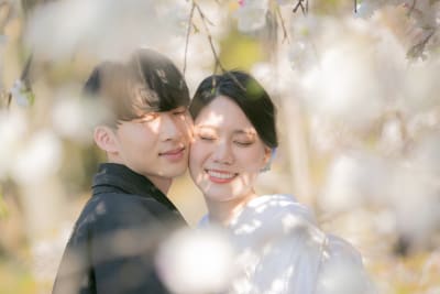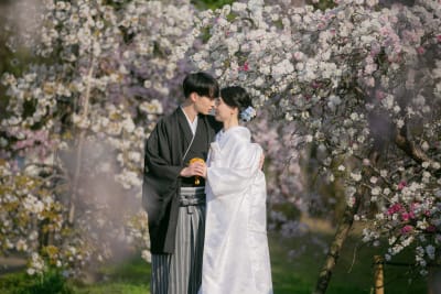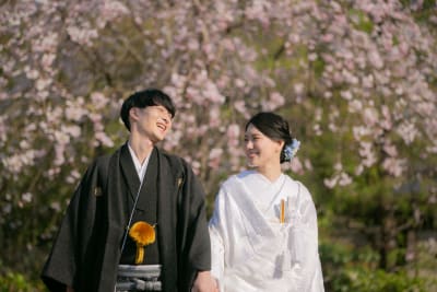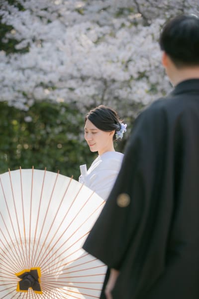 桜ピンクの中で白無垢が際立って綺麗ですね!