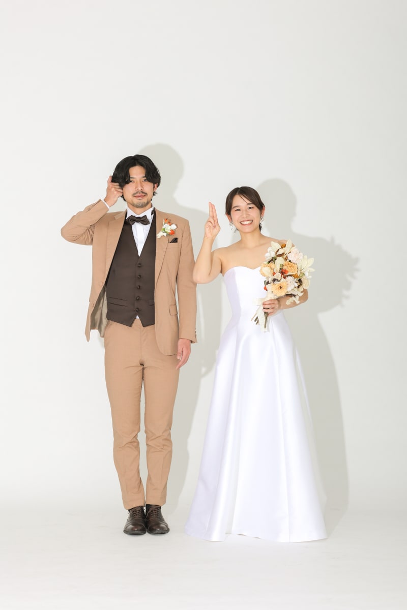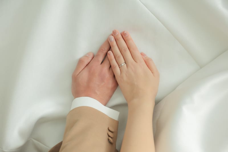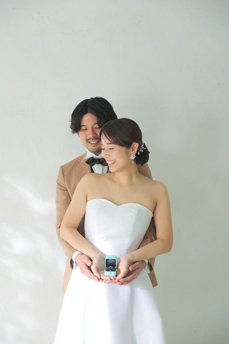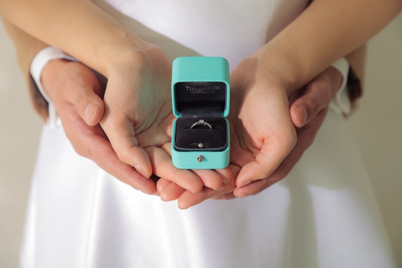 指輪の箱の色もワンポイントとして手元のアップがいい感じです!