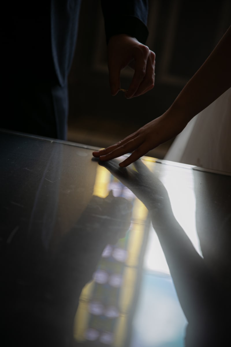 中央公会堂の特別室の醍醐味であるステンドガラスがテーブルに反射して、丸形を描いているような幻想的な一枚。