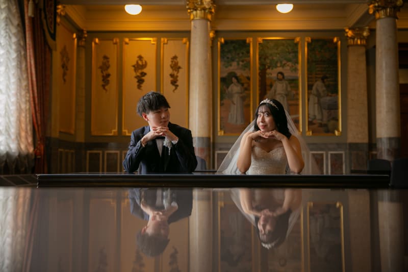 見つめ合うお二人がガラスにも反射して、可愛らしいお二人が主役のお写真ですね。