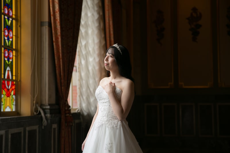 ステンドガラスの窓を見ながら凛とした表情を浮かべる新婦様。