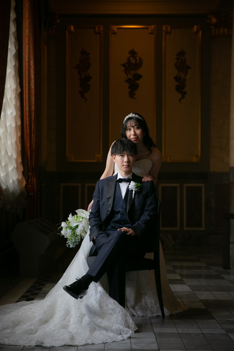 新婦様のドレストレーンの華やかさと新郎様のスタイルの良さが際立つお写真。