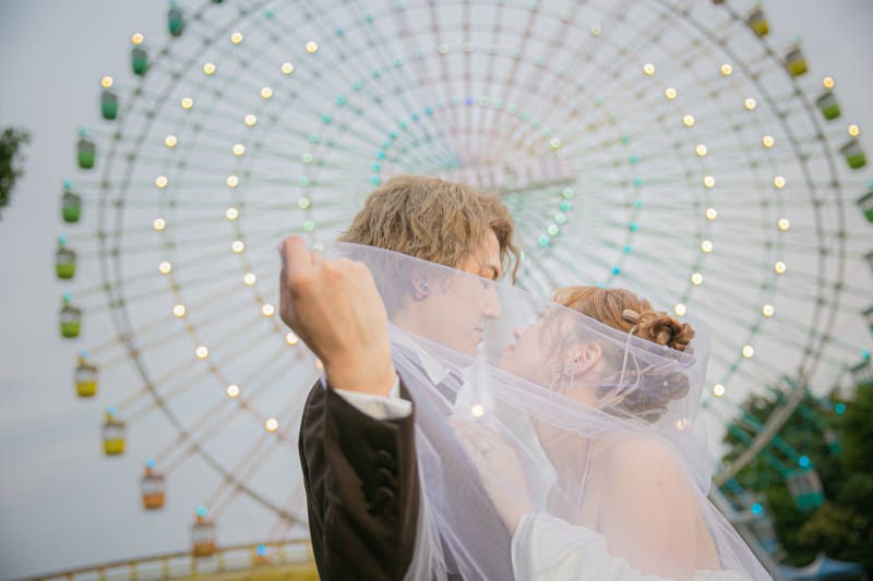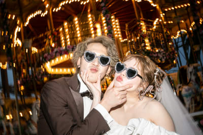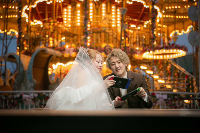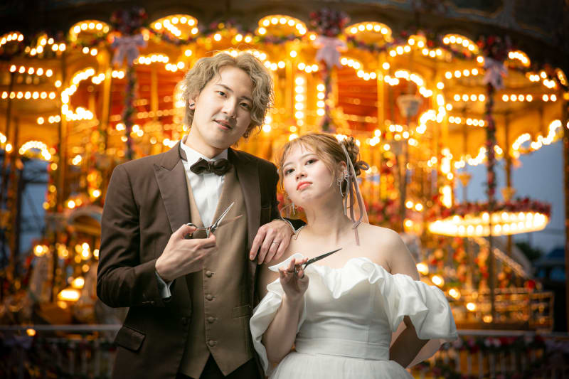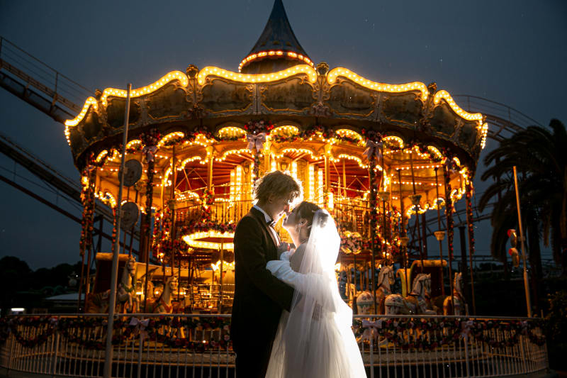 メリーゴーランドのライトアップが一段とお二人を輝かせてますね。