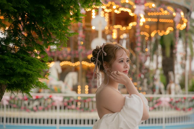 ライトアップされたメリーゴーランドをバックに幻想的なショット☺︎