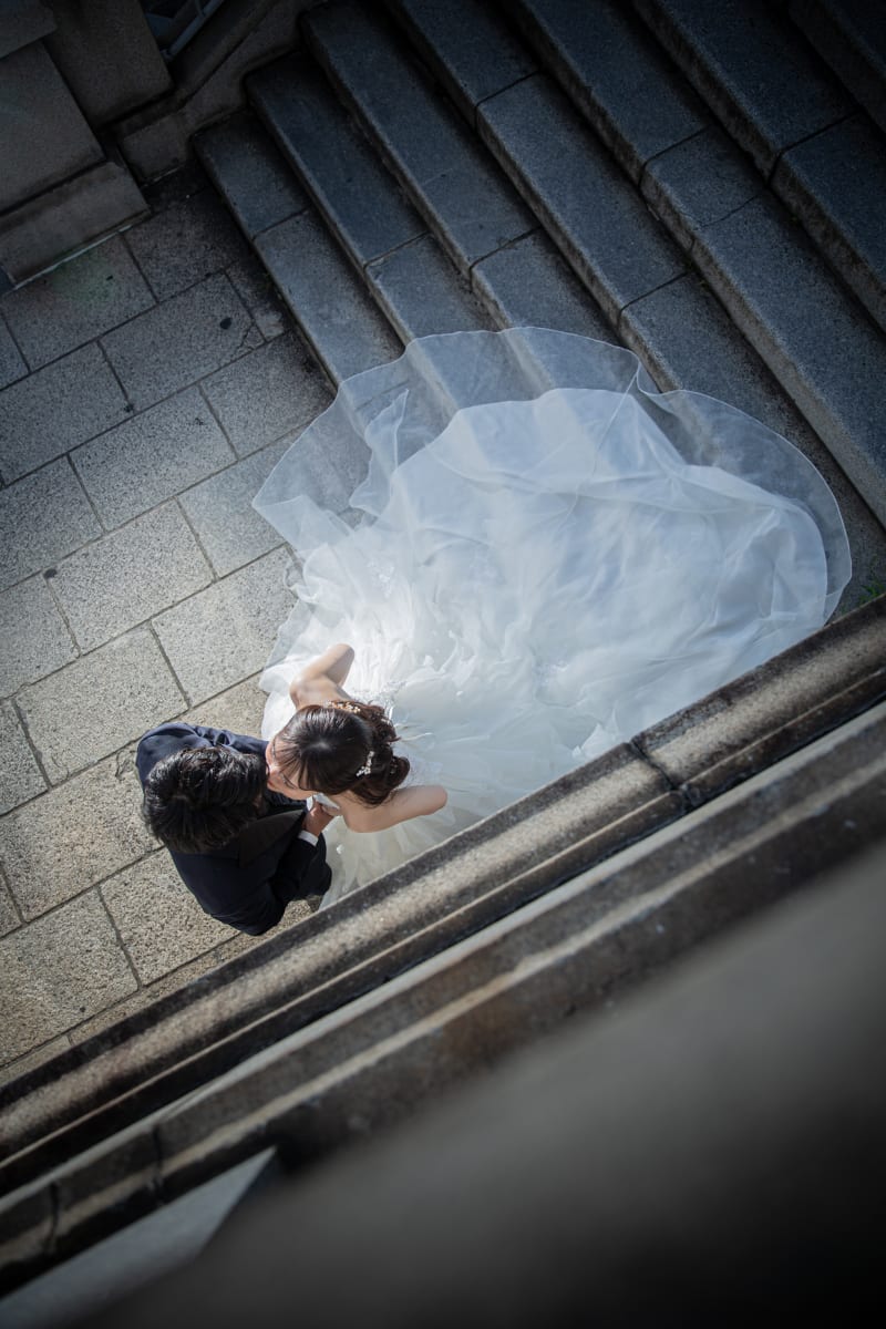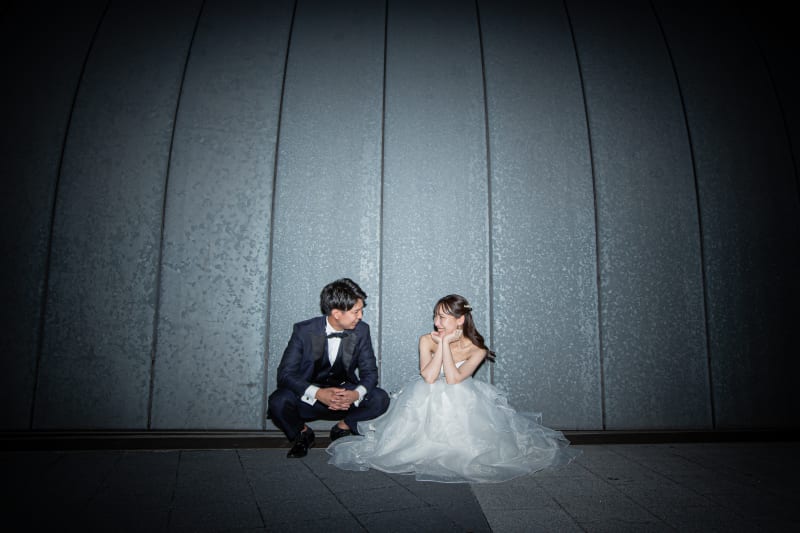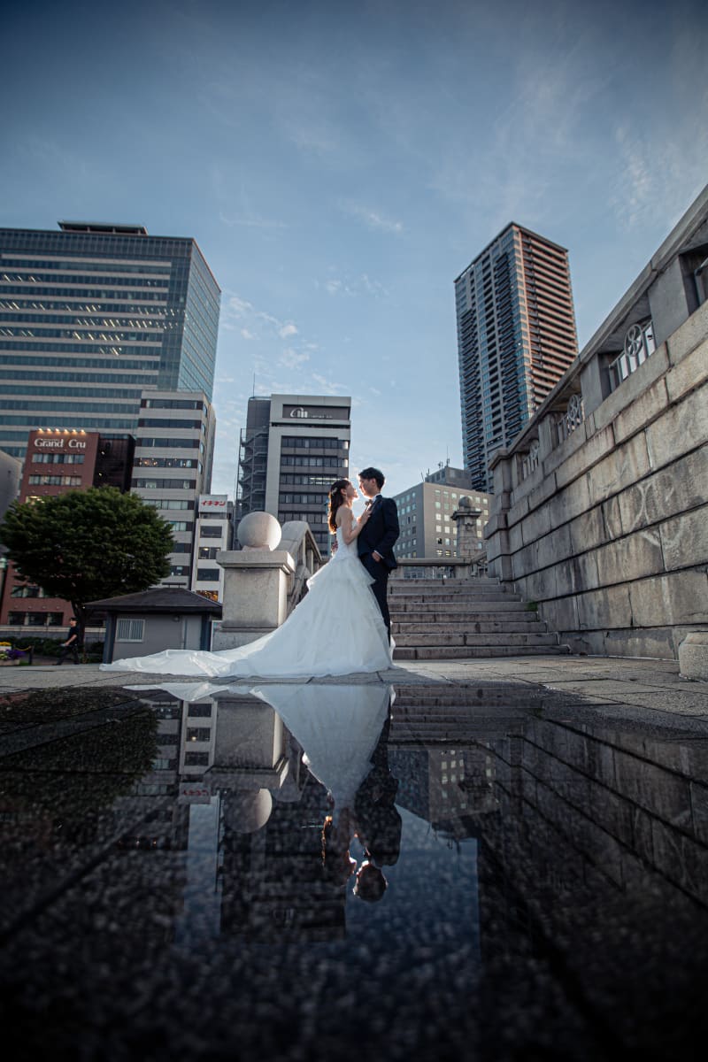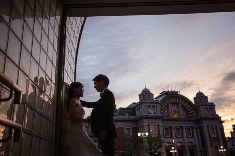 新郎さんが壁ドン!!夕陽と中央公会堂の背景がとてもマッチしていて幻想的な一枚に。
