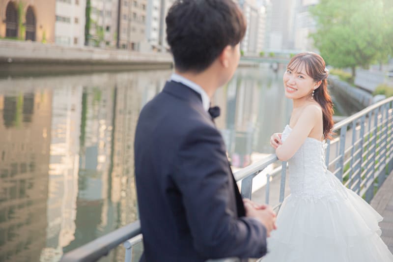 川沿いで何気なく会話するおふたり。自然な笑顔がすごく素敵ですね♪