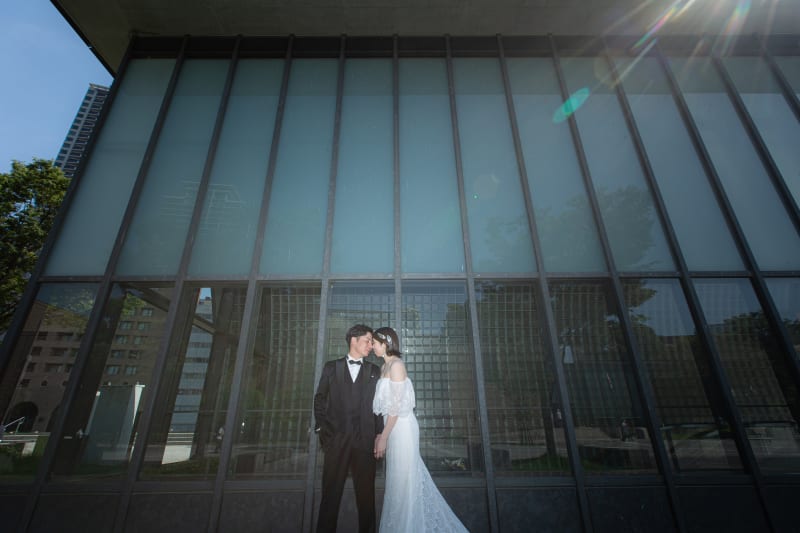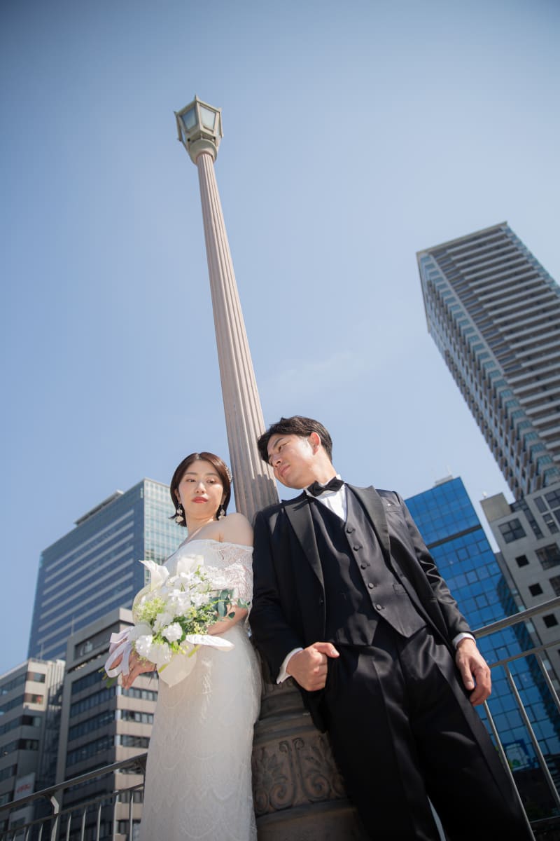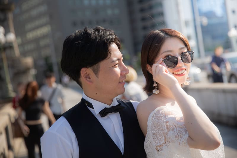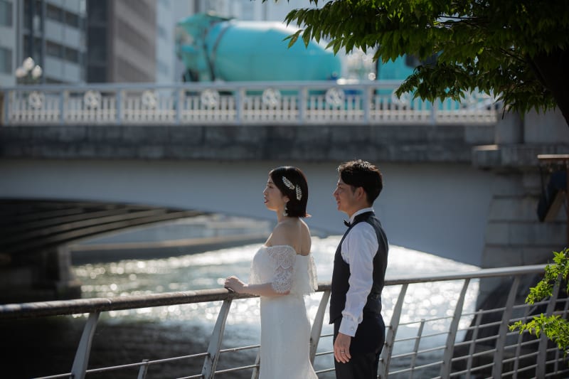 先日、中之島公園にてロケ撮影を行いました。今回は昼間の撮影ということもあり、強い日差しの中での撮影となりましたが、それ以上におふたりの笑顔がまぶしく、暑ささえも忘れるような、爽やかな時間となりました。