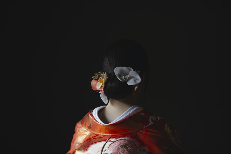 つるっとシニヨンで大人っぽく、打掛に合わせて暖色系の飾りで仕上げました!