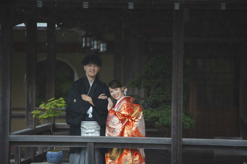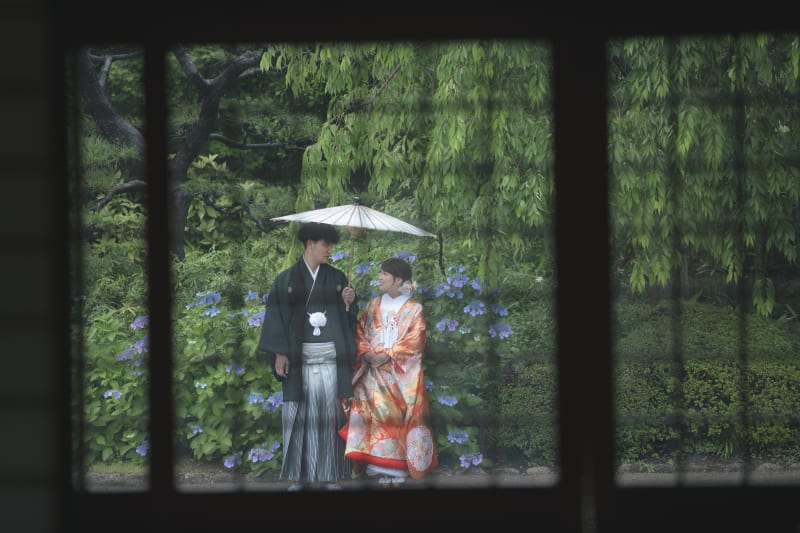 庭園の静けさと、雨のしっとりとした雰囲気が、写真をお二人唯一のものにしてくれます。