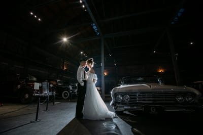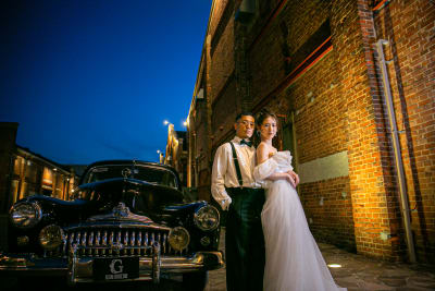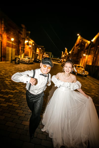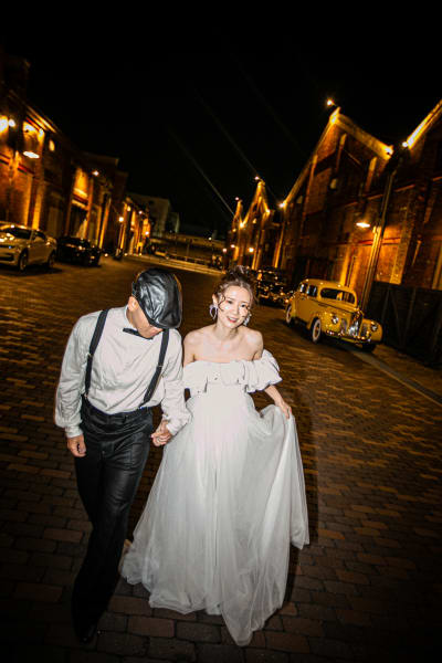 暗くなった赤レンガ倉庫に新郎様がお持ち込みしてくださったサングラスとハンチング帽がとても似合ってます!!