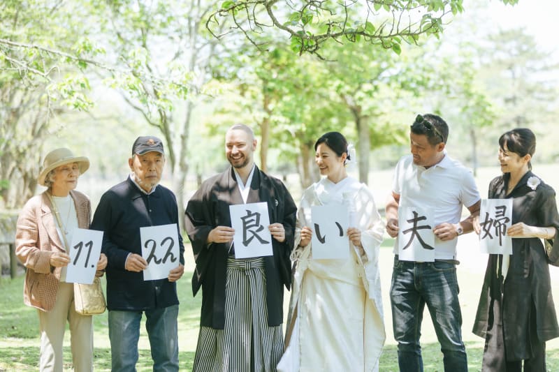 「11.22良い夫婦」と書かれたボードを持って、みんなで笑顔の集合写真。
