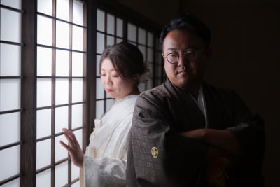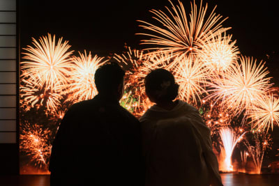 窓から差し込む光や、背景の美しい紅葉が、和装のお二人をより一層引き立てていました。また、花火が映し出された幻想的な空間での撮影も行い、ロマンチックな雰囲気の一枚を撮影することができました。